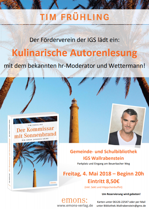 Der Förderverein der IGS hat für seine nächste Lesung ein besonderes Häppchen für die Zuhörer und Genießer ausgesucht. Wir freuen uns ganz besonders, dass wir den beliebten hr-Moderator, Wetteransager und Autor Tim Früling für eine Lesung gewinnen konnten.