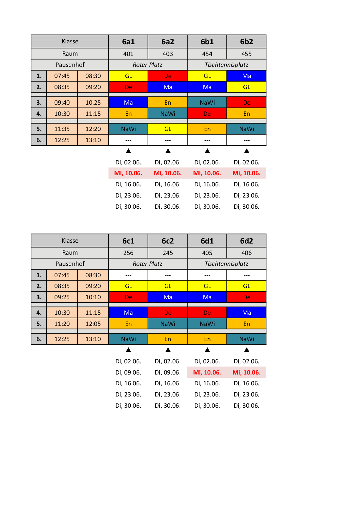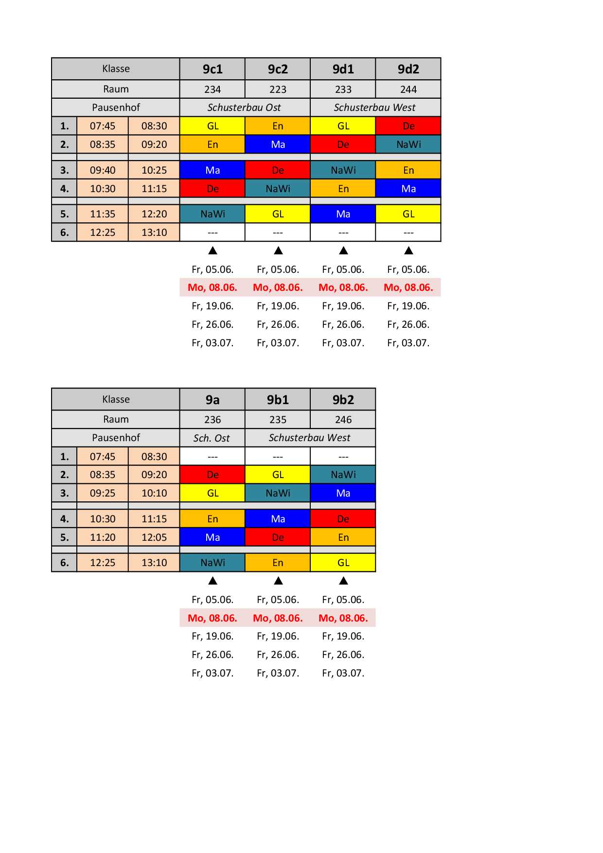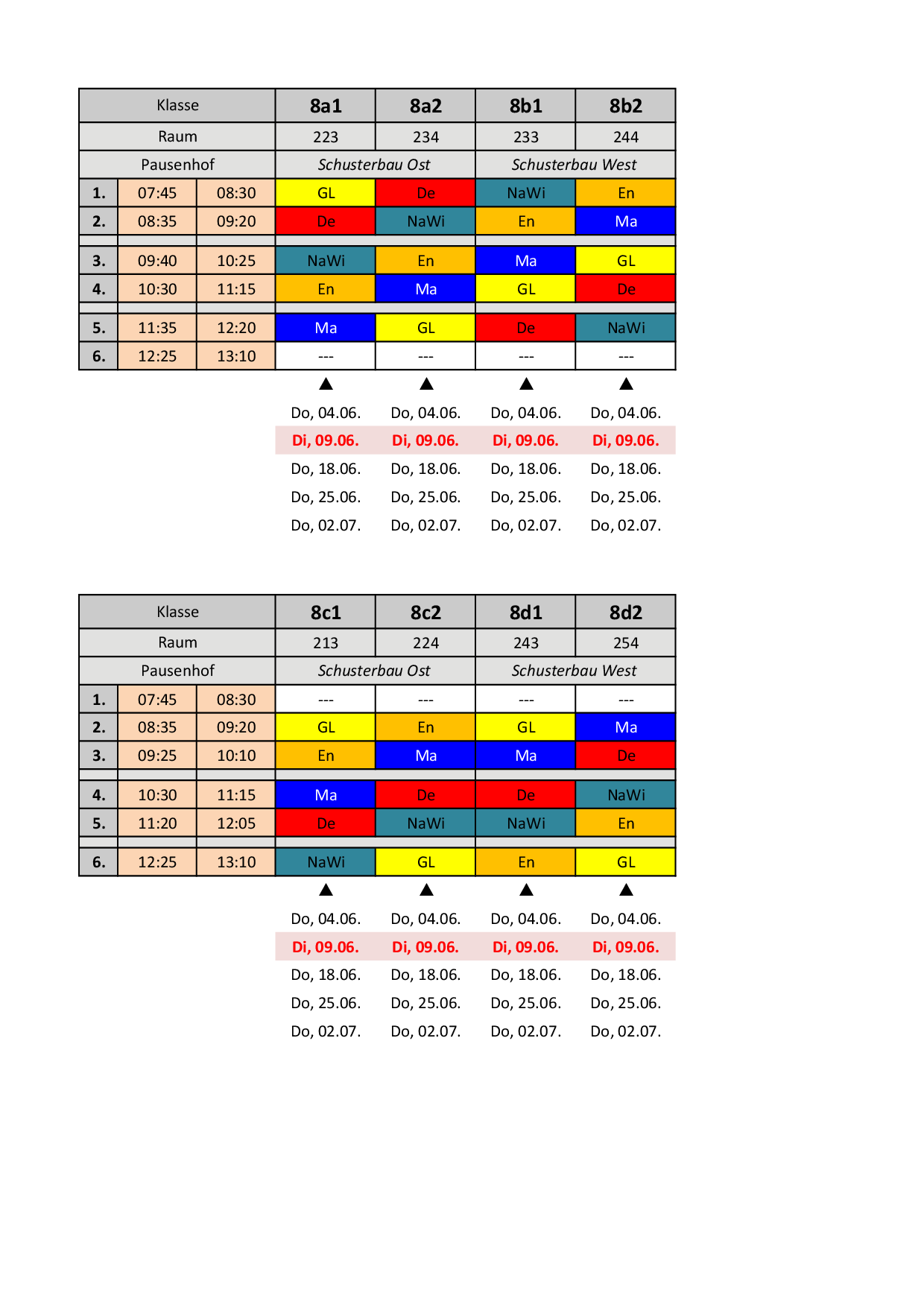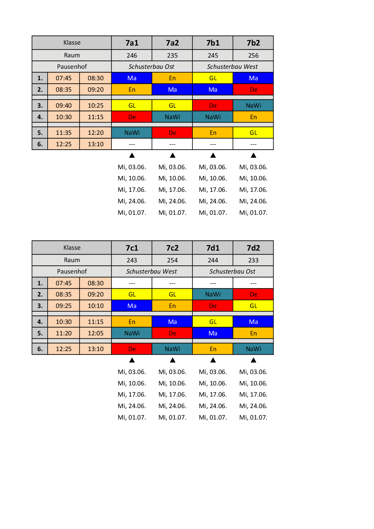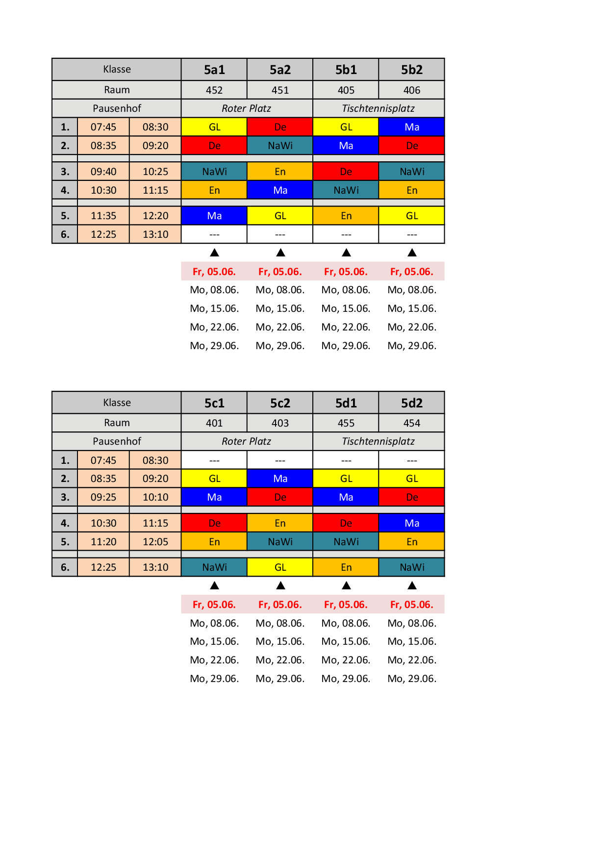 Bis zu den Sommerferien gelten folgende Pläne: