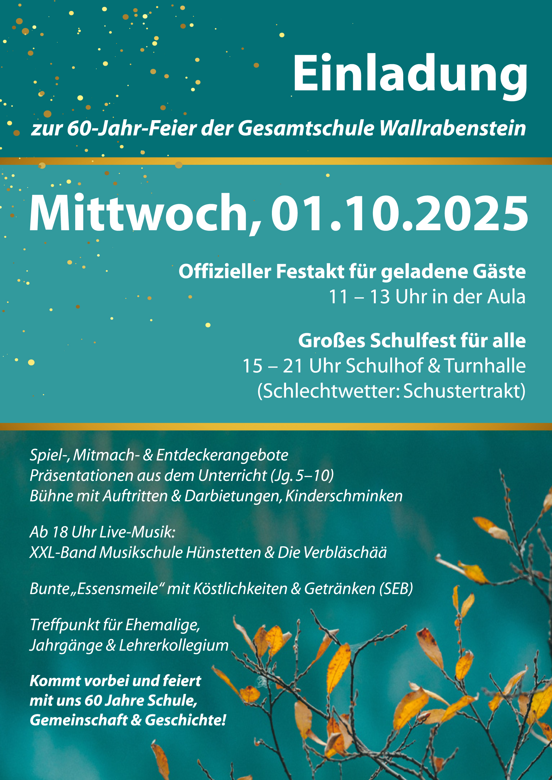 Die IGS Wallrabenstein lädt herzlich zur Feier ihres 60-jährigen Bestehens ein. Am Mittwoch, 1. Oktober 2025, wird das Jubiläum mit einem offiziellen Festakt sowie einem großen Schulfest für alle begangen.